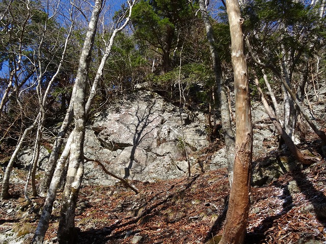踏み跡は薄いですが、要は明瞭な尾根を登ればいいだけですから迷うことはありません。暫くして大岩というか岸壁に