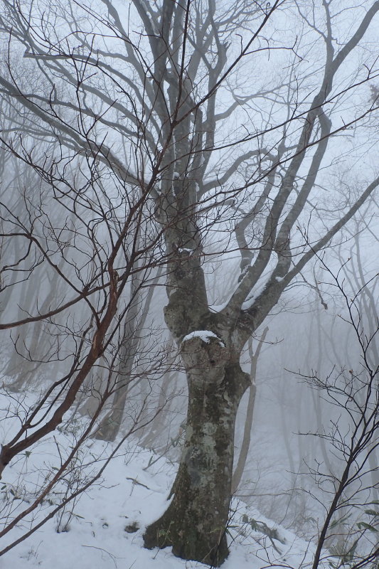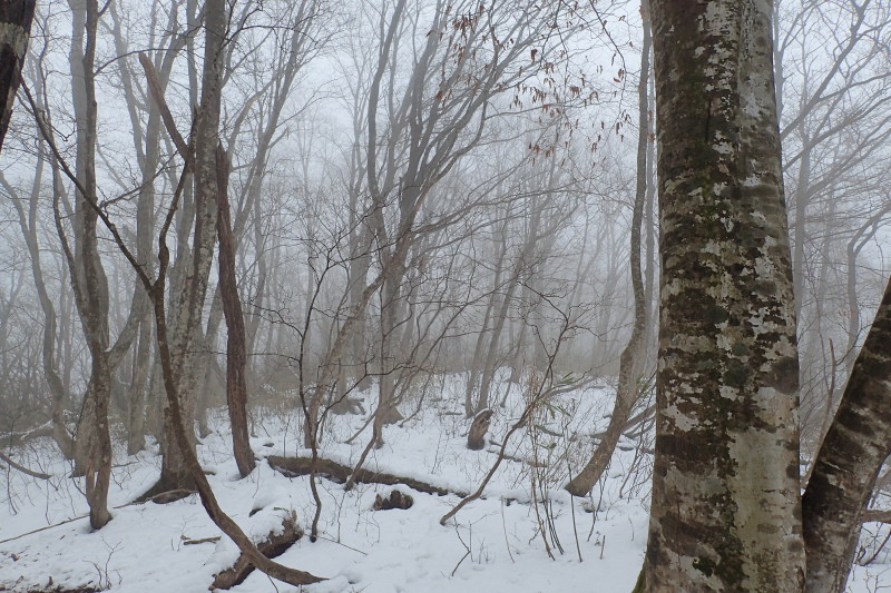 > 山頂手前のブナ林は実に素晴らしく、実際どうかは知らないが、原生の森を思わせる荘厳な雰囲気がある。多分にこの霧が寄与しているのだろうが。