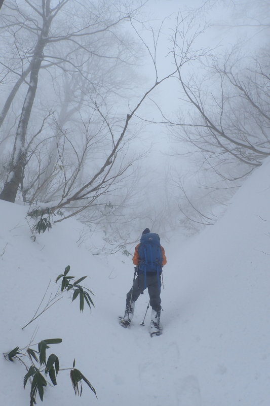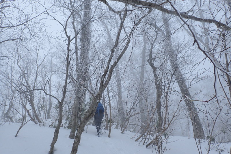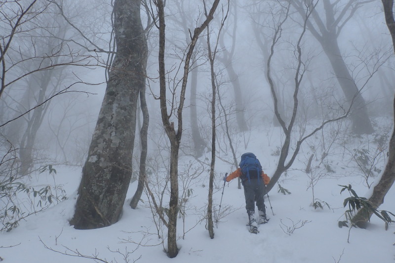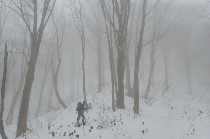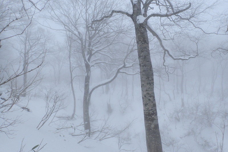 > 高度を上げるにつれ、空は晴れるどころかガスの濃さが増して来た。こうなるともうあきらめの境地である。開き直って、霧にむせぶブナ林を楽しもうと腹をくくった。