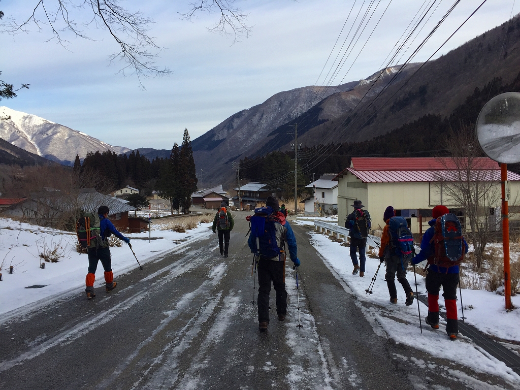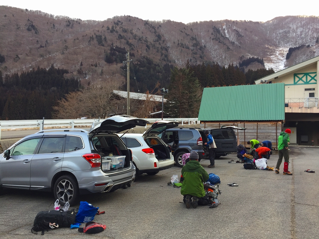 朝5:00過ぎくらいから、それらしき人影があり、6:00には、全員集合する。ここから4台に分乗して、飛騨白川郷、白弓スキー場に向かう。国道156号線を北上し、御母衣ダムを越え、白山平瀬道登山口に向かう道に左折するところで、今回は右折して、庄川を渡り、白弓スキー場駐車場に着く。駐車場に全く雪は無い。山も白くない。準備していると、「スノーシュー持って行くの?」とか、「スノーシュー、ザックにくくらずに手で持って行けばいい?」とか、いやみな質問が飛ぶ。