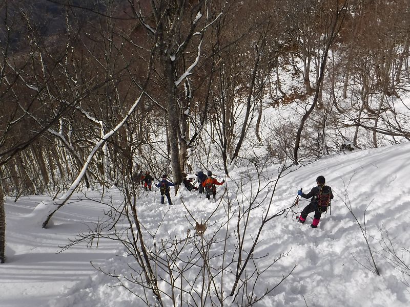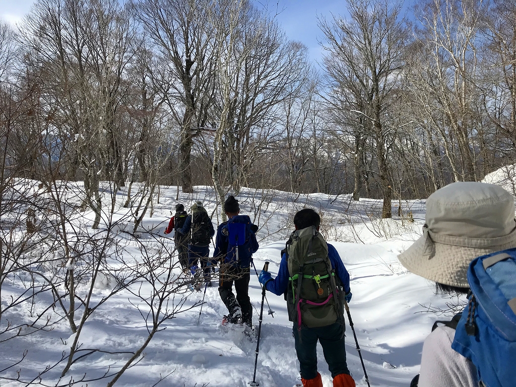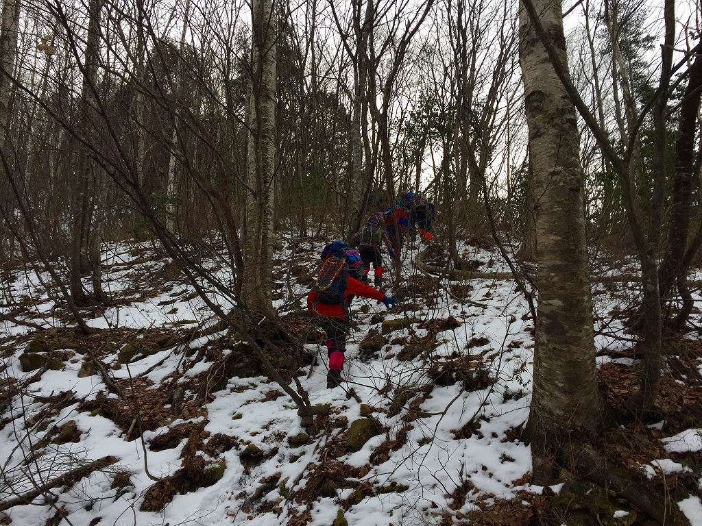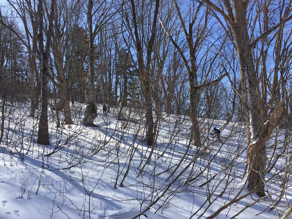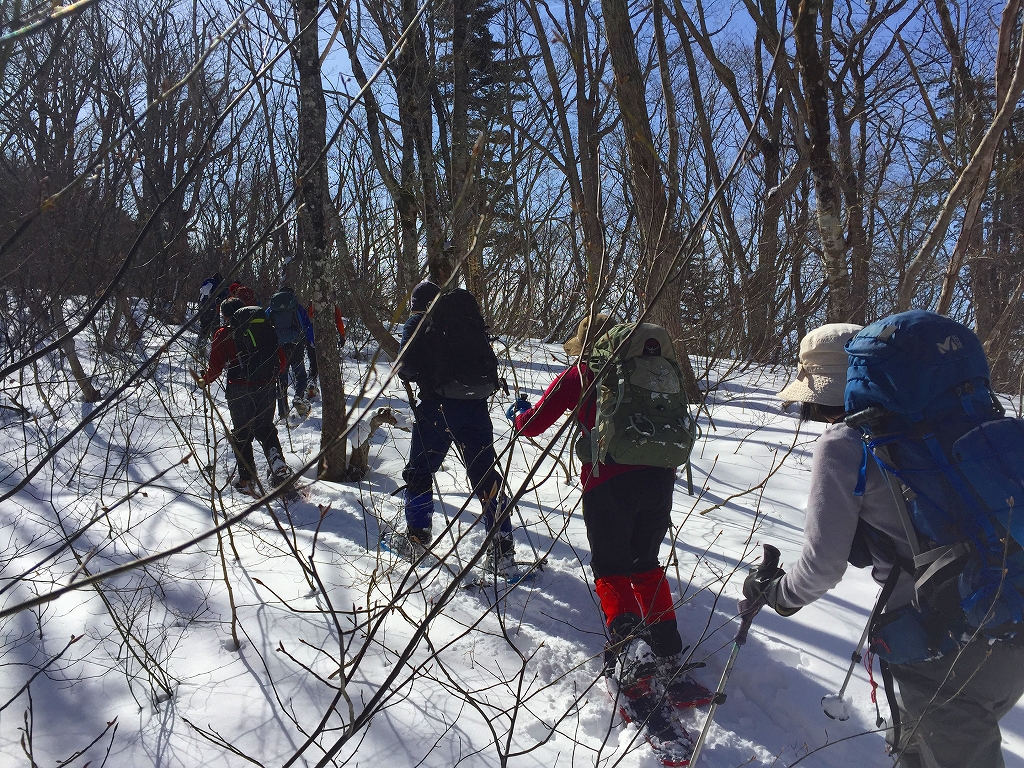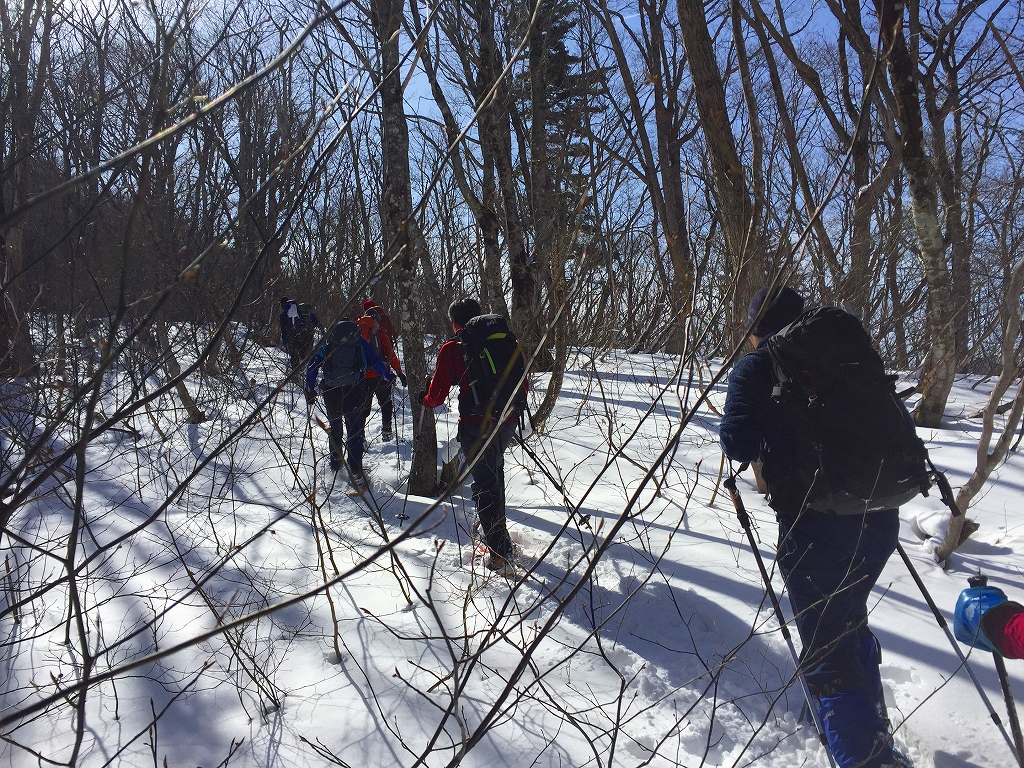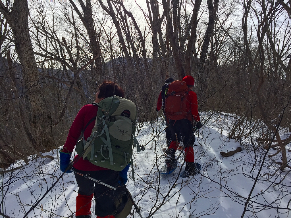 舗装道路を歩き、無舗装の林道をしばらく歩き、尾根尻に着く。道には雪はほとんど無い。山斜面には少しだけ雪がある程度。やぶと言うほどではないが、登山道という感じではない。でも、道はついている、とのことだ。1時間ほどで956.6m三角点に着く。ここを越えると雪が繋がって来た。標高1000mを越えたところで、スノーシューを装着。登るにつれて、だんだん雪が増えて来た。ただ、低木の細い木が出ていて、時々、顔にピシッと当たり痛い。