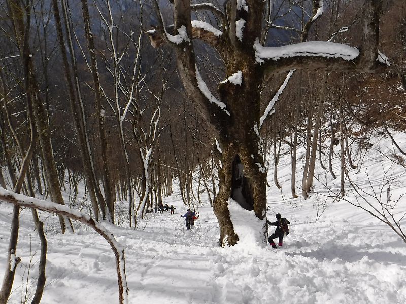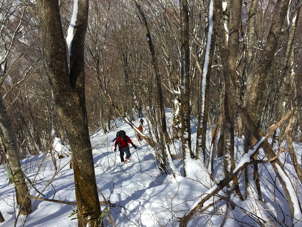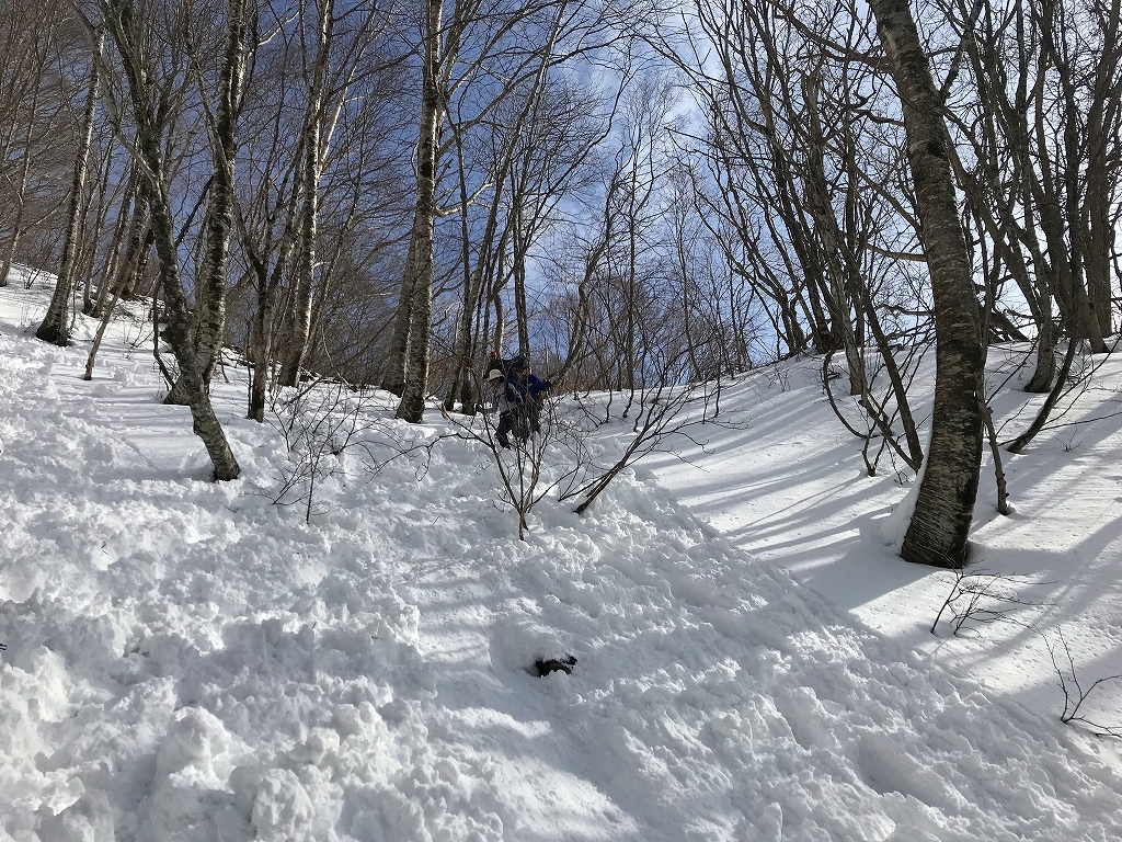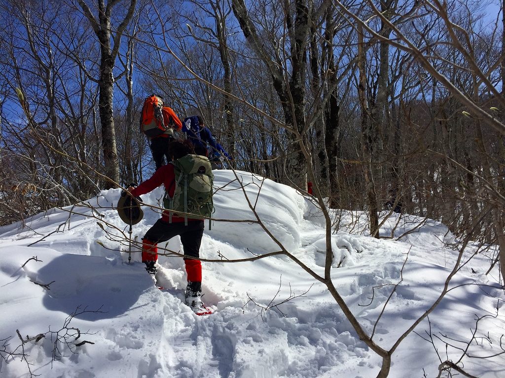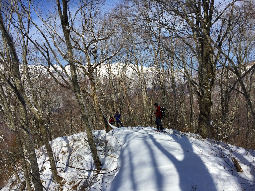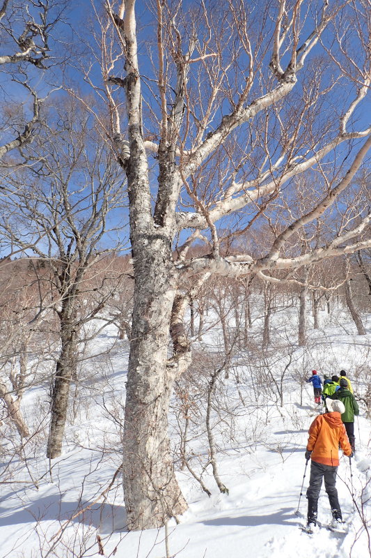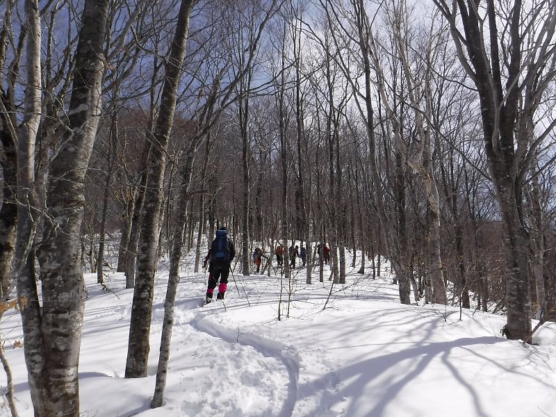 おかげで山仕事で使われていた尾根の雰囲気を味わうことが出来ました。雪が増え、ブナが現れてくると、青空も広がってきました。