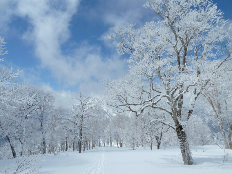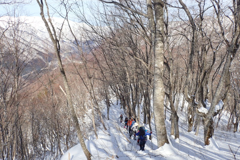 10時ごろになると、空も晴れて来た。雪もスノー衆らしくなってきた。ブナの木も出て来た。標高1,300mを越えると、ブナがたくさんあった。雪も増え、南側に小さいながらも雪庇が出来ていた。ラッセルも必要になってきた。うさぎの足跡があちこちにあった。振り返ると、別山、白山が真っ白に見えていた。