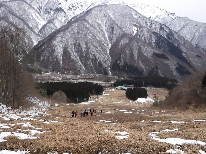 下山は、途中までは登って来た尾根を下降。標高1,400mを下ったところで、尾根をはずれ、スキー場に向かって西向きに、向きを変える。ここでスノーシューをはずし、チェーンスパイクを装着する。最初は、支尾根を激下る。次に尾根をはずし、谷に向かって激下る。雪が適当に柔らかいので怖くはない。延々と雪斜面を激下る。チェーンスパイクの下がすぐに雪団子になって歩きにくい。最後はスキー場なのだが、雪がほとんど無く、荒れた枯れた草原。延々と歩くと、スキー場駐車場に着いた。