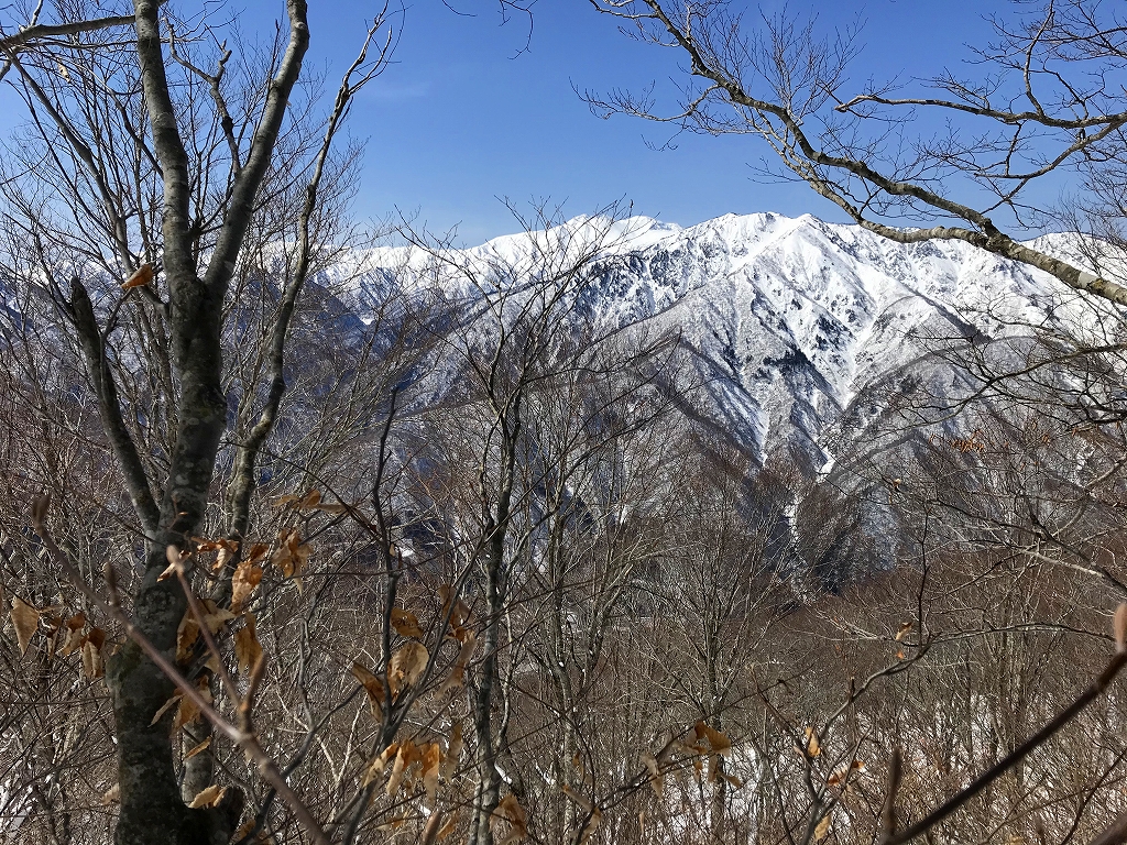 木々の間から望む三方崩山の白く煌めく稜線にこころが吸い込まれそうになりました。