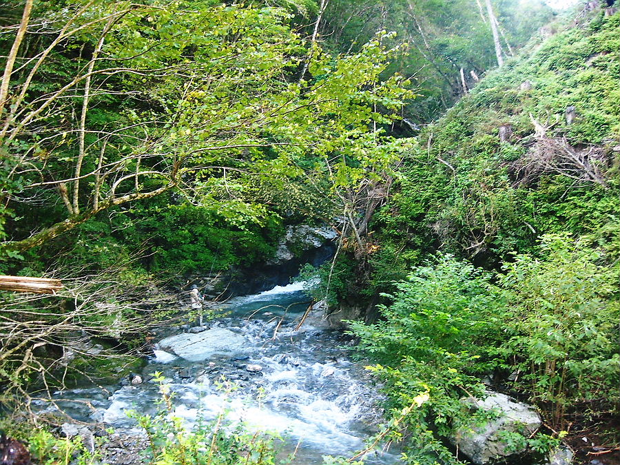 グングンくだる潅木帯、沢は増水してる、対岸に渡り未だ下降していく。