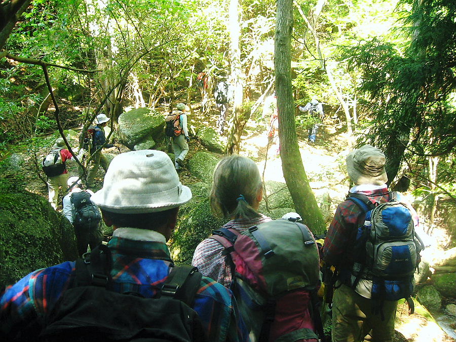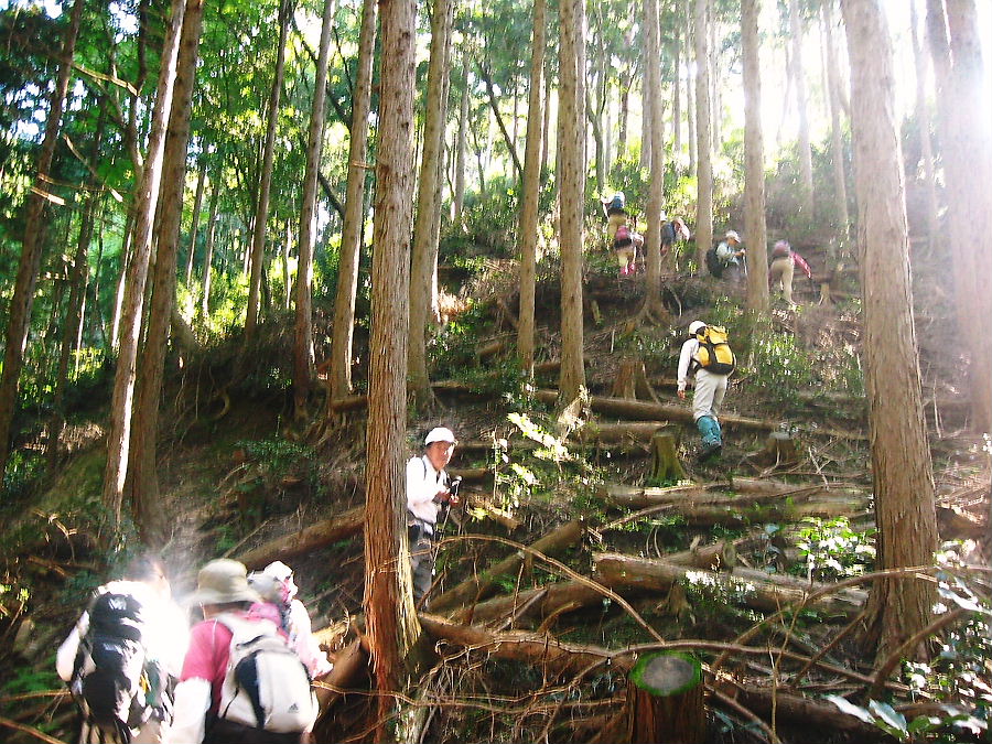 堰堤バック水過ぎて山道に入る、間伐材の転がる歩き難い道もリーダー先導ヨロシクグングン上がるよ。
