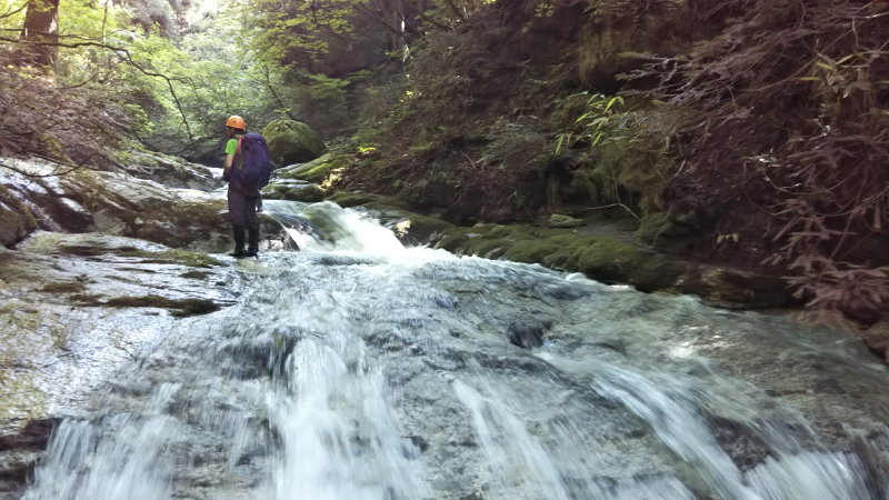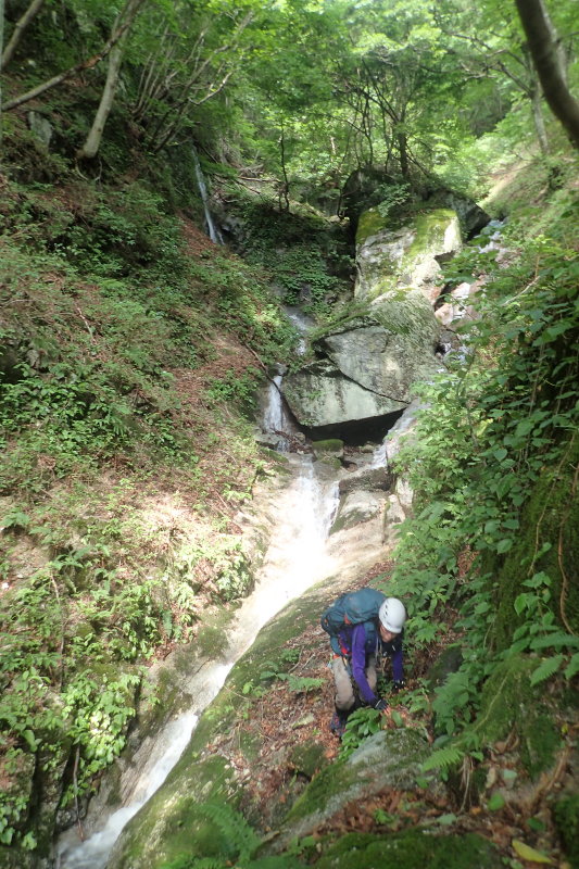 10m以上の滝が次々に現れ、懸垂下降の支点になる木もない。幸い、左右どちらかにノーロープで辛うじて下りられる