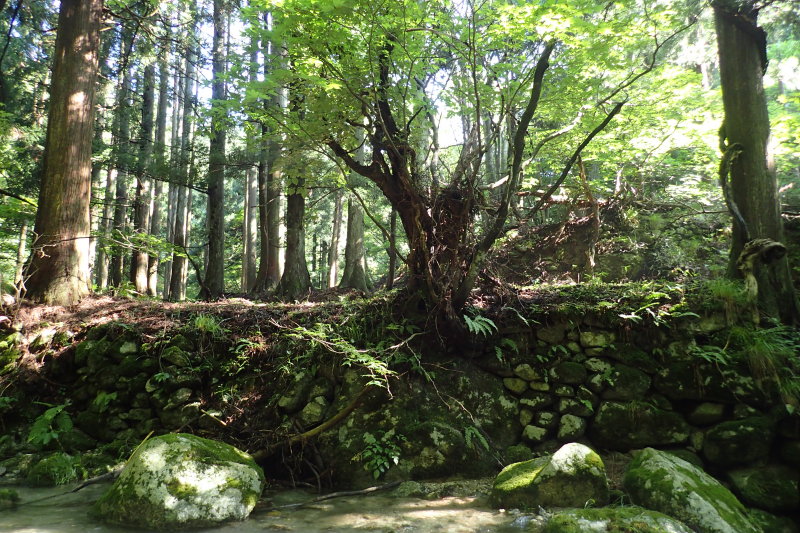ナメを過ぎると平流となる。驚いたことに、こんな山中にも石垣を組んだ田畑の跡がある。谷の入口の左岸側にも広大