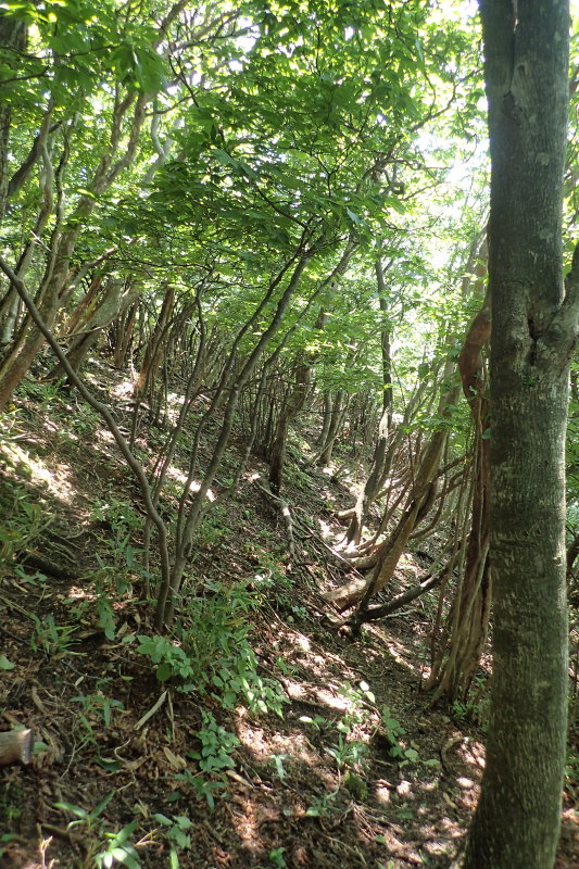 >国境稜線を南下して行くと、道は西側斜面を巻くように付けられており、意外なことに笹ヤブではなく樹林帯の中を進むようになった。昔から山仕事で使われていた部分なんでしょうね。