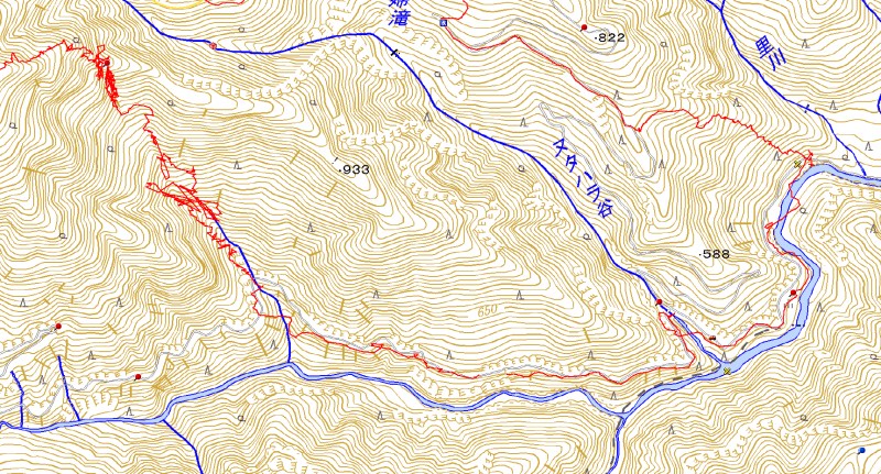 目的を達成できなかったけど崩壊の下部はそれほど急な斜面でもないし、意外に穏やかな林になっているように思う。崩落と言っても僅かな土石の量だからきっと斜面でとどまっているのだろう、滝を巻いたときに横切った岩屑の詰まった浮石の斜面がその部分で有ったようにおもった。