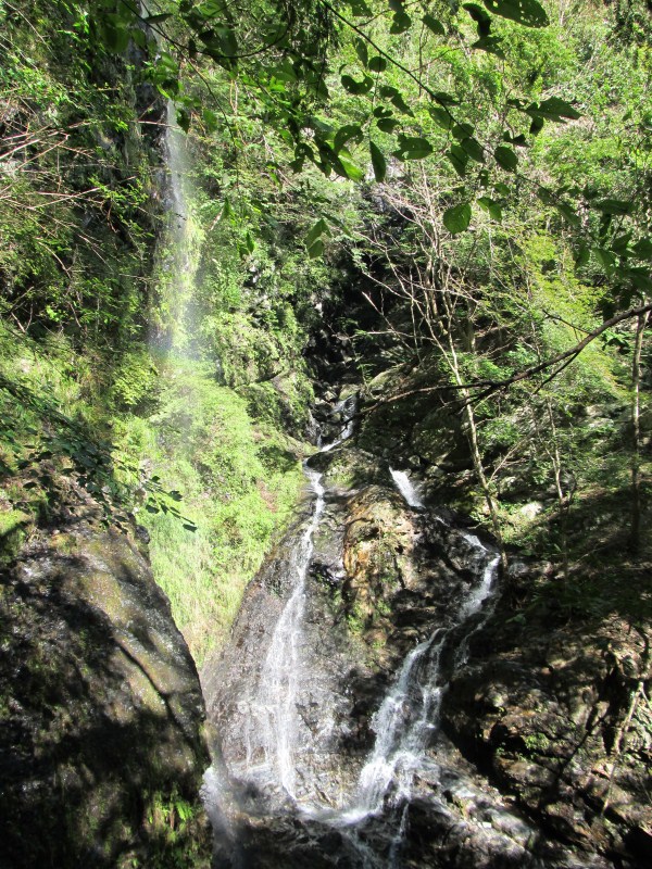 上部は二次林で有ろう斜面が続くまっすぐ登って行けそうだが谷の上部を見たいと、再び左に向かい小尾根を登る、左方向下にさっき登って来た谷が見えるがかなり高度差が増している、いくつか掛かる滝を見下ろすが両岸を壁にはさまれているので逃げ場は無い様だ、私の技量では巻いて正解だったのだろう。