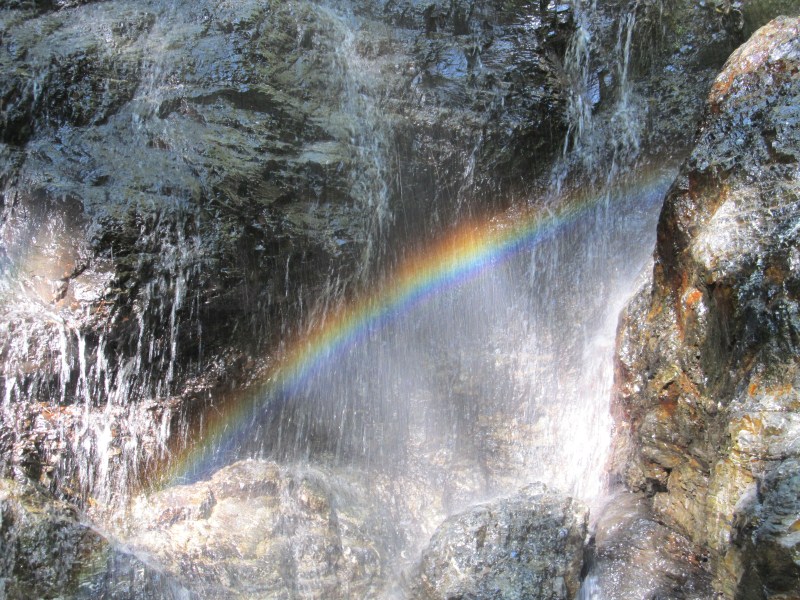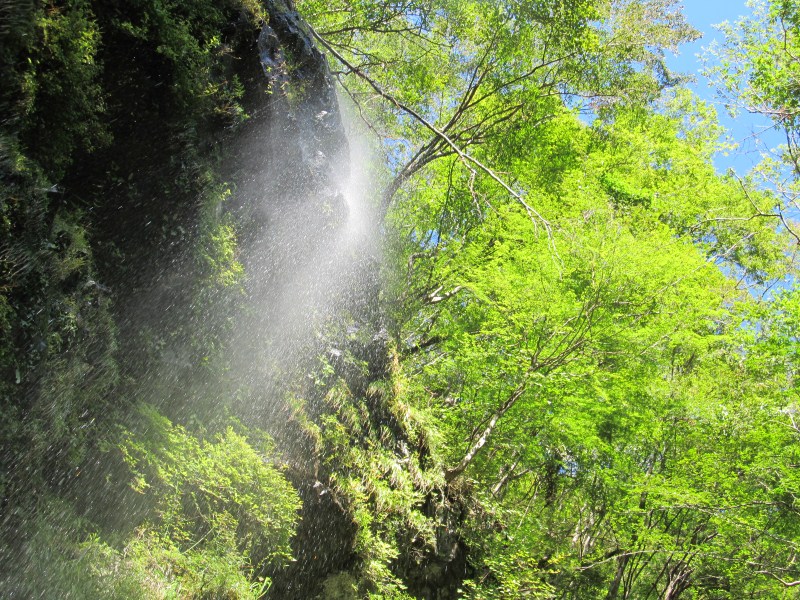 ここは二股と言っても両方の谷に滝がかかる、左又の滝は25m位だろうか頭上から降り注ぎ、右又の滝も10m位の滑を二筋に分かれて落ちてくる、「D」の字に見えるこの滝は奥の平谷のサスケ滝に似てないかなぁ。朝日を背から浴びて虹も出て中々雰囲気のいいところでしばし休憩。 まず左股の滝の上に出られないか確認しに登る、急な斜面を少し無理すれば上がれそうだが、この谷をたどると裏ヒキウスに上がってしまうのでパス。進むべき右又の「D」字の滝は右の水流を登れば登れそうだが濡れるのが嫌なのと、上った奥がゴルジュ帯のようで先が見えないのでこれもパス。すでに自然林になった左岸斜面ににトラバースして小尾根を乗り越すと、洞窟でもあるのだろうか?と思える暗い空間が有った、近付き回り込むとそれは浸食深いルンぜで有った、ここは水少ない水流を上がれそうだが滑りそうなので巻く、木の根を掴んでクライムアップ上部に出た。