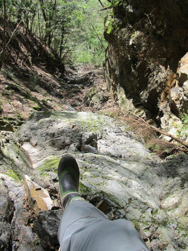堰堤を乗り越えると4段ほどの小滝が連なる、中々いい感じだが倒木が景色の邪魔をしている、谷の岩は大水で洗われたのだろう苔もなく滑らず快適に登っていける。左岸は植林地で行き詰まれば逃げられるので安心感は有る、右岸は頭上に突峰が迫っているので岩嵓が多く暗い雰囲気、きっとどこかで行き詰まる予感がした。しかし登りにくい所も無く二股に付いた、GPSで確認するとここからは右又に向かわないと行けない。