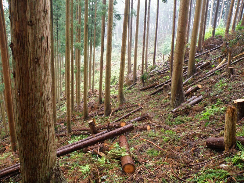 林道に出て蓮に直接下る古道に入る、前回は少しのぼり尾根にトラバースして尾根芯を下った。下にも作業道があるので今回はこちらをたどってみた、ここの植林帯は最近まで間伐作業が行われていたところだがすでに作業も終わり倒木も片付けられていて歩きやすい、途中で尾根芯ルートと合流、これは楽だなと思ったら下部はまだ間伐材が放置されており木を跨いだり登ったりで思った方向に行けず、それでも何とか抜け出して車に向けて一直線に斜面を下ると7,80m下に車が見えた、この辺りは間伐剤を引きずり落としたのだろう跡が残っている、滑るように下りながら林道の車の横に着地した、難儀はしたけどこのコースは早いなぁ。今回も朝から膝が痛かったけど何とか歩いて来れました、でも千石林道の報告は無しです