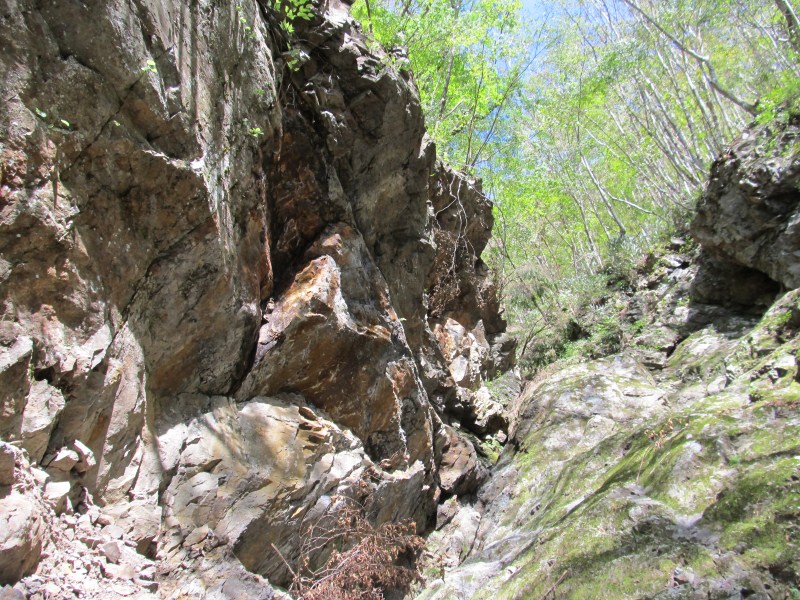 谷には中々降りられないのでそのまま登るとやがて谷が上がってきて標高差のなくなった所で谷に復帰した。すでに水流もなくなりさらに狭くなる、枯滝となった岩場を登っていくが傾斜もきつくなってきてるので緊張するところもあった。右岸はオーバーハング気味の岩嵓が続く、左岸は上がれそうなところもあるがもう少し上が楽かな?と思いつつ登ると意外にいやらしい、ではもう少し上、とそんなことを何度か繰り返し上がっていく。しかしこの先は左岸も上がれなくなり傾斜も急となった、もう源頭部に近いのであろう事が判る。ここで左岸に逃げないと進めないなと、外傾した滑りそうな岩を足場にこわごわトラバースして少し登るともうそこはヌタウの尾根芯であった。がしかし出たところは崩壊は所を完全に通り過ぎ岩場の巻の有るすぐ手前で有った。