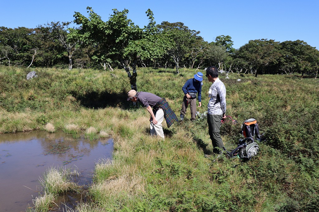 ここで自分らは元池に向かう。ルートをちょっと外れるだけだがこの池に寄る人は少ない。今回も自分らだけ。この池はイモリが沢山いるのでいつもそれを確認するが、今日はいない。どこへ行ったのだろう。そして数は少ないがオタマジャクシが結構泳いでいる。この時期にオタマジャクシのままでは果たして越年できるのだろうか。ちょっと気になる。今日は急ぐこともないのでここで持参のグレープフルーツを皆で食べる。これも暑い時期の定番の差し入れ。いつも通りの行動だ。