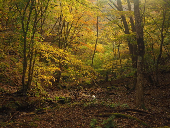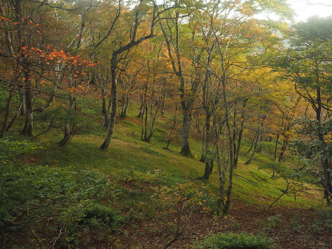 山毛欅の樹々が明るく輝く南西の源頭に誘い込まれるように下降する。途端に林床には一面に柔らかい草やイワヒメワラビの緑が広がり、山毛欅の黄葉と美しいコントラストを見せてくれる。