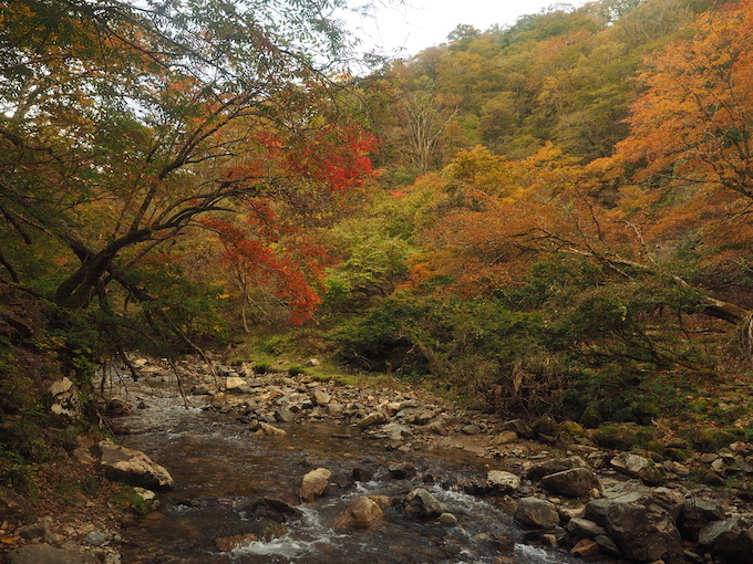 谷の正面には西陽を浴びた黄葉が照明器具のように黄色い透過光で谷を満たしている。小さな流れに沿って谷を下ると、呆気なく思うほどに白滝谷との合流部に到着してしまう。山と高原地図ではボウダラ谷と記されているが、谷の出合の石標にはクマアナ川と掘られている。後は白滝谷の流れに沿って下降するばかりだ。紅葉の樹々が彩るを下降する。