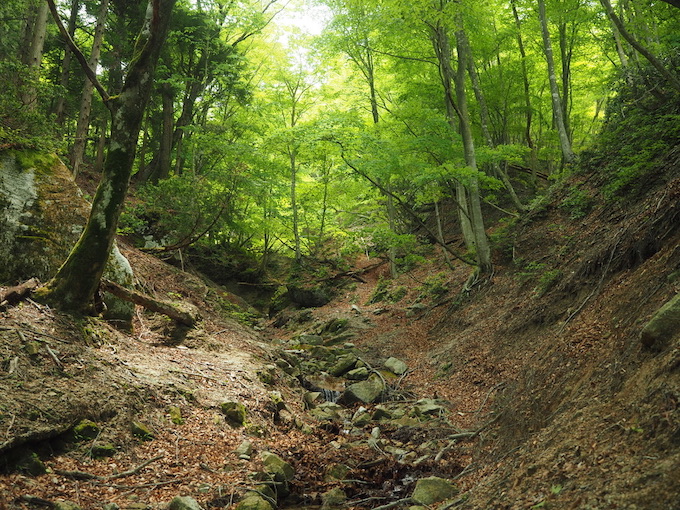 谷奥へと進むと上部には御神体のような巨岩が現れる。源頭の流れはこの巨岩の左手から湧き出ているのだろう。巨岩の裏に回り込むと水が切れるので、ここから草つきの斜面を登ることになる。
