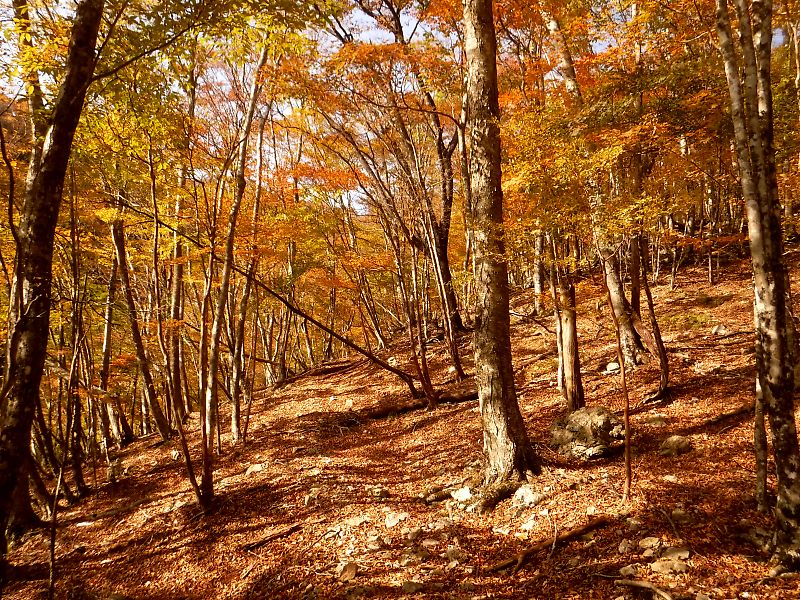 登るにつれて周囲の木々の黄葉は一層鮮やかに感じられる。周囲の斜面の林床を覆う小紫陽花の葉にも黄色が斑らに入り、黄葉が始まっているのだった。もう少し時間が過ぎると一様に鮮やかな黄葉になることだろう。小紫陽花の間ではイワヒメワラビの群生が未だに保つ若々しい緑色が目立つ。