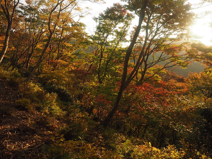 「西陽を浴びた黄葉が照明器具のように黄色い透過光で谷を満たしている」