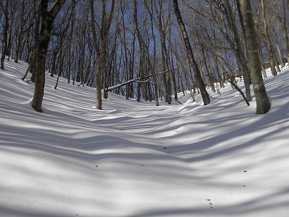 次のコルから東雨乞まできつい登りが続きます。ワカンを持って来ればよかった思うもザックにはスキーやらプラブーツやらいっぱい付いていて付ける場所もないし歩荷も苦手だから仕方ないかと諦める。