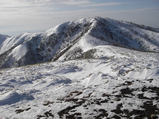 ほんの僅かな距離を進むのに半時間もかかり13時20分になって、ようやく東峰山頂に着きました。強風が吹きつける山頂だけはほとんど雪がつきません。