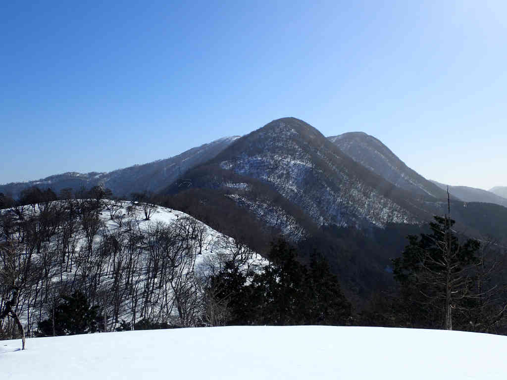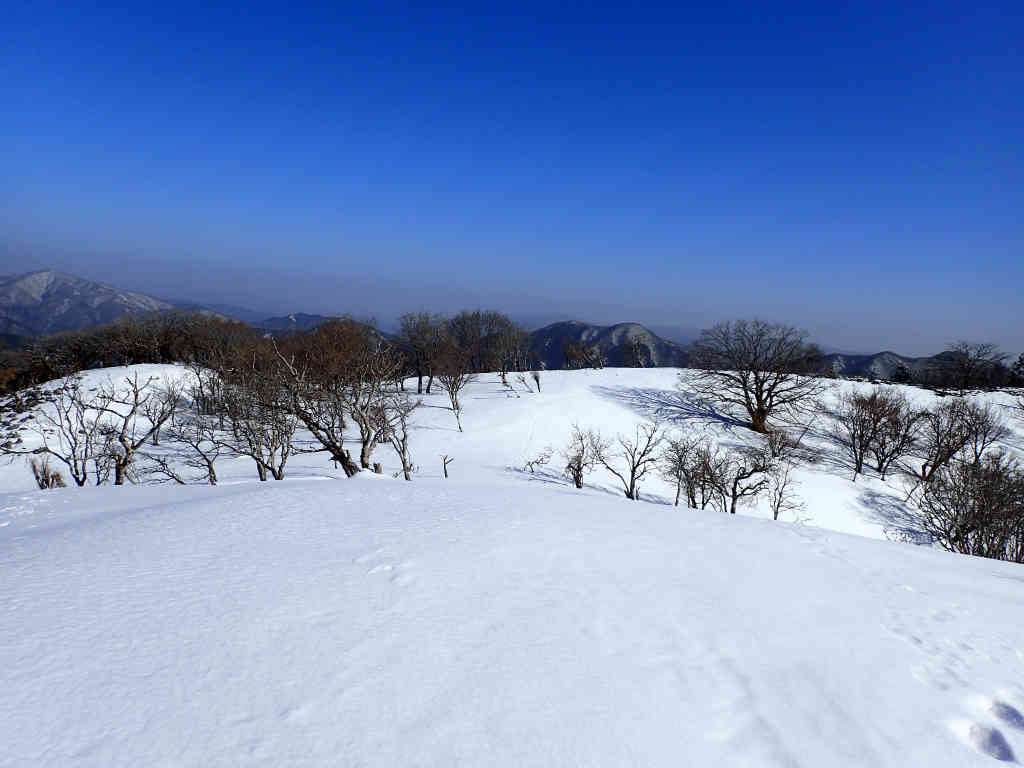 怠け心を奮いたたせ,鈴北岳に向かう。一旦桜峠まで下り,標高差約200mを登り返す。冬枯れしたミズナラ林は明るくて気持ちがいいのだが,