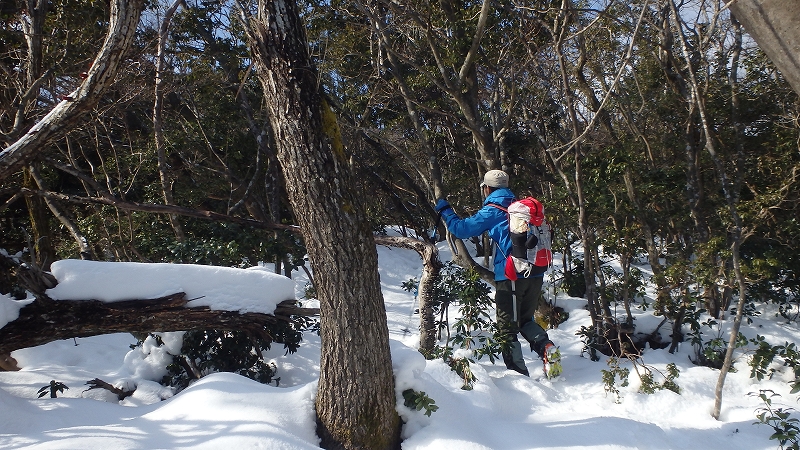 平坦になった尾根はアセビなど低木のバリアを避けながらの「牛歩」。残雪は予想外に少なく、まだ壺足のままで大丈夫だ。