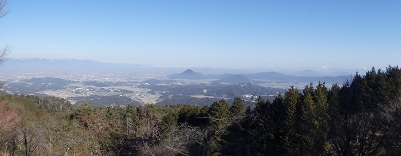 駐車場(標高590m)からの眺望が素晴らしい。比良~湖北~伊吹~霊仙~鈴鹿の主峰が連なり、手前に三上山や金勝アルプスの岩稜が並ぶ。