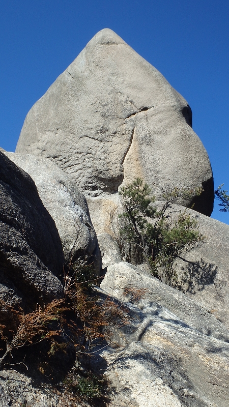 岩の基部にベンチが2基。ザックを置いて登ってみるが、ルートミスなのかヤバいところへ出てしまった。足腰だけでなくアタマの方も疲弊していそうだ。安全第一!臆病風に身がすくみ、すぐ退散。下のベンチに戻ると、単独男性が笑いながら「小学生でもスイスイ登ってますよ」だって。ほっといてくれる(-"-)