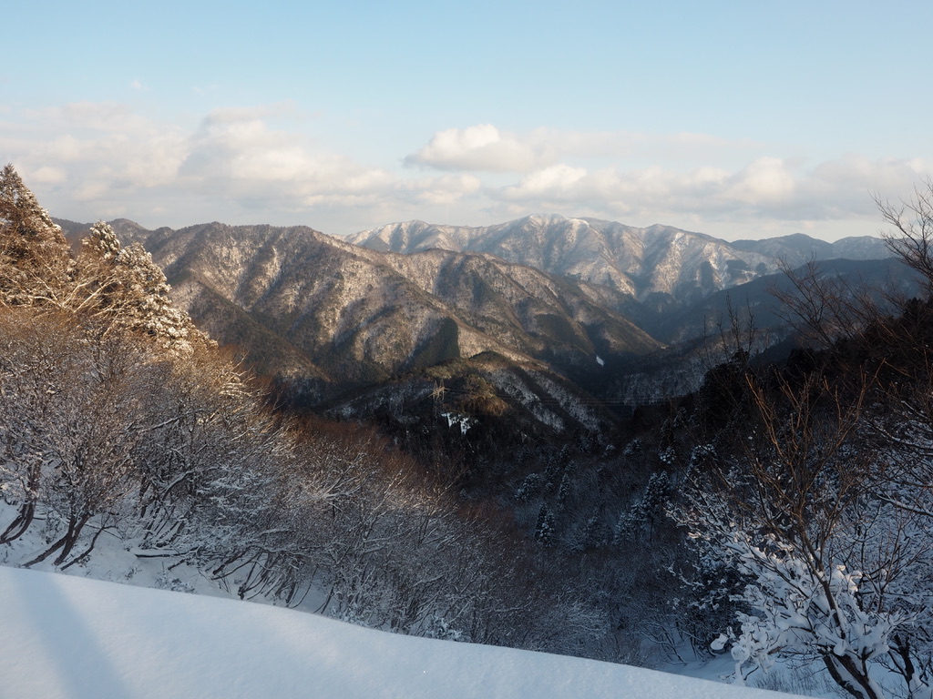 山々の上からはすっかり雲が取れて、薄曇りの空から柔らかな日差しが降り注ぐ。何よりも嬉しい誤算であったのはこの好天だ。高島市あたりの天気予報は大きく外れたようだ。経ヶ岳の右手には白銀に冠雪した百里ヶ岳も見える。