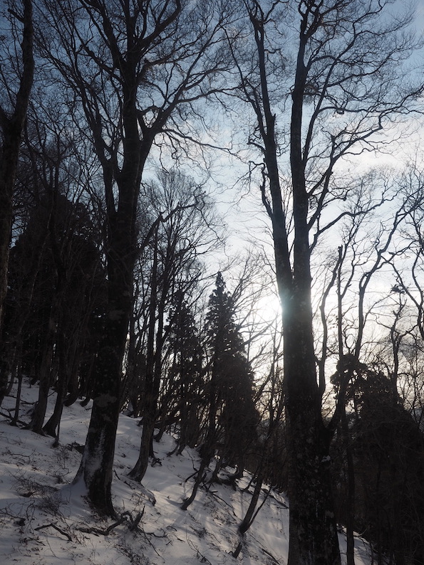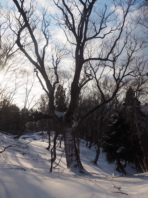 京都に向かうと空には明日にかけて再び天気が崩れるという予報が信じられないくらいの綺麗な残照が広がっているのだった。短時間ながら新雪のトレイルに巨樹、そして望外の好展望を楽しめた午後であった。