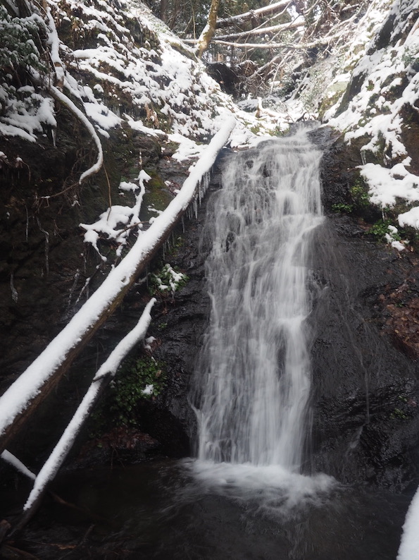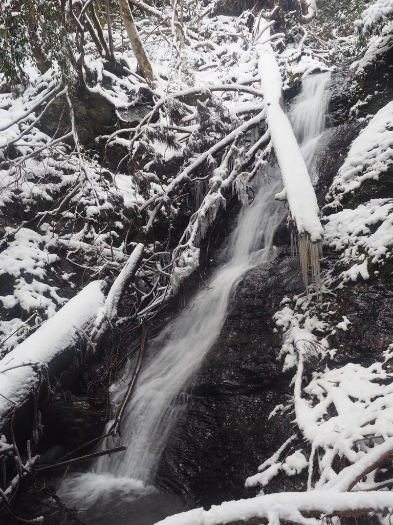 道路はその先にある久多の浄水場まで除雪されているようだ。ここからは新雪の降り積もった林道を歩くことになる。見後谷の出合にくるとこの右岸尾根が経ヶ岳に至る尾根になるのだが、まずは見後谷の左俣に入ったところにある滝を久しぶりに訪れる。
