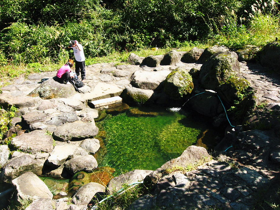 露天風呂は太い水パイプがあるでしょう。源泉温度は70度以上あるからうめないととてもは入れんでしょう。