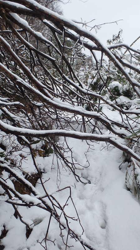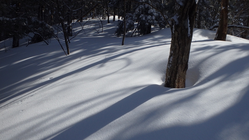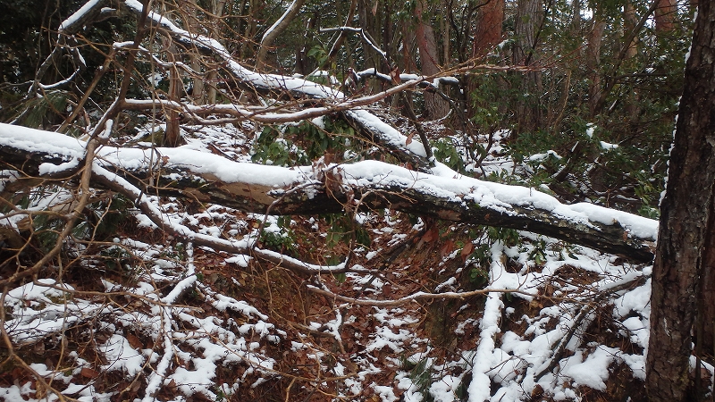 なんでこんなに苛ついてるんだ?立ち止まって心を落ち着かせる。そうだ、急ぐ必要はないんだ。行きつけるところまででエエやないか…。雑木の枝に積もった雪が首筋に潜り込んで「冷たっ!」と苛つくなかれ。マツの葉先から滴る水滴が陽光に輝く。迷路パズルを解くように倒木の隙間を通り抜ける知恵比べ。……