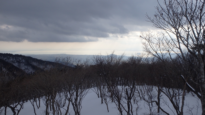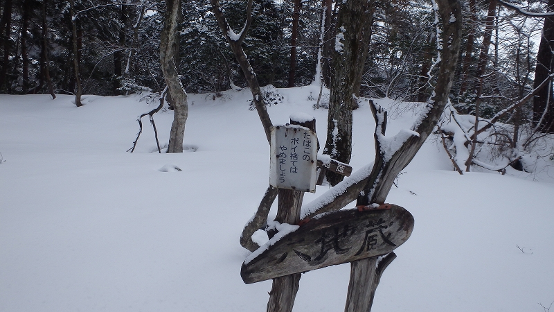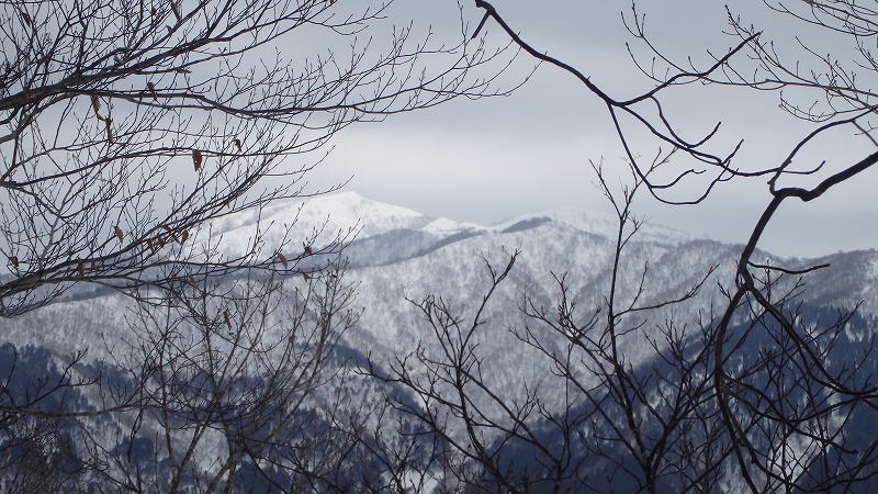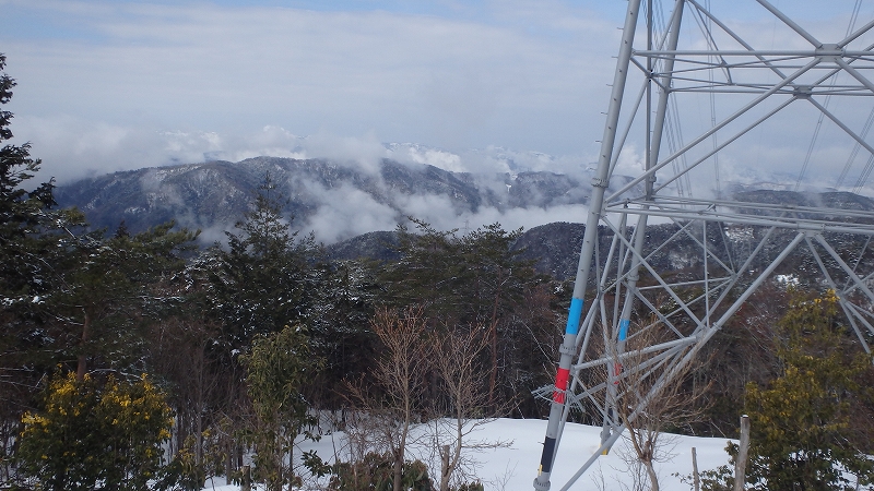 平坦地に登りつき「六地蔵」だ。石仏は雪の下でお休み中。尾根の向きが北東に変わって、緩斜面になると2本目の送電鉄塔へ。P2100485.jpgここからは北側の眺望が開ける。谷の向こうに見えていたのは横山岳など余呉の山々だったんだろう。右前方にはめざす己高山らしい山塊。もう11時前。あと1時間あれば…?と勝手に推測して見たのだが…。割り切ったはずなのに時間が気になる。