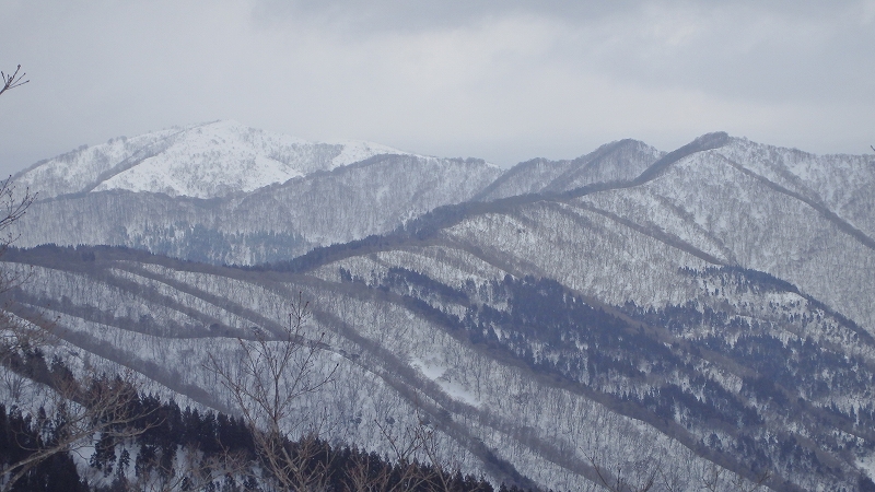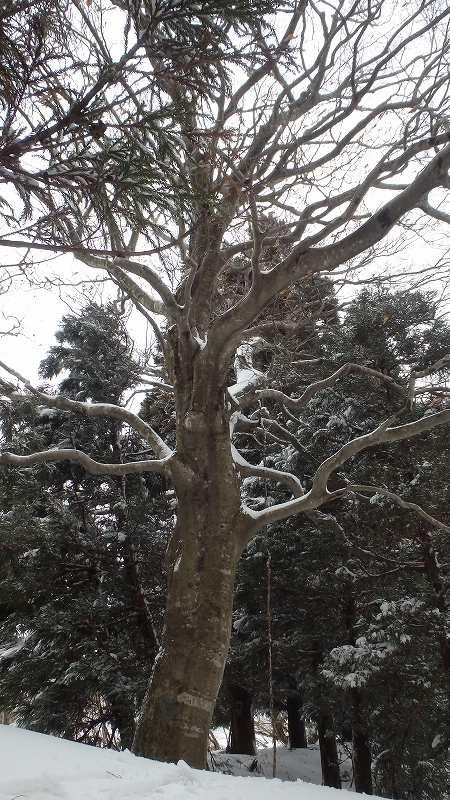ゆっくりしすぎたかもしれない。14時を回ってしまった。食事しながらこれからの行程を考えていた。時間が心配なら8年前の登山道を下る選択肢もある。しかし、選んだのは北尾根からの周回。始めから決めていたように足が向く。 未踏のルートだが、尾根がはっきりしているので迷うことはないだろう。山頂付近の尾根筋には、植林の杉の中にブナの巨樹も混じる。右手に金糞岳を眺めながらのシューハイクだ。jctピークまで大きなアップダウンも無い。