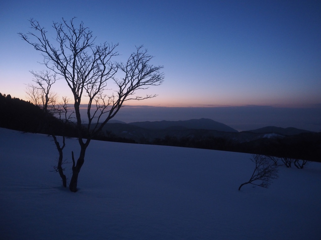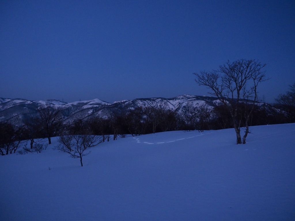 気が付くと背後の三国山から大谷山へと至るまでの国境稜線は深い藍色のモノトーンに染まっている。周囲の雪原も青一色だ。英語ではblue hourと云うが、元来はフランス語のl’heure blueの観念らしい。実際には世界が全て青く染まるのは刹那とも云うべき短い時間だ。
