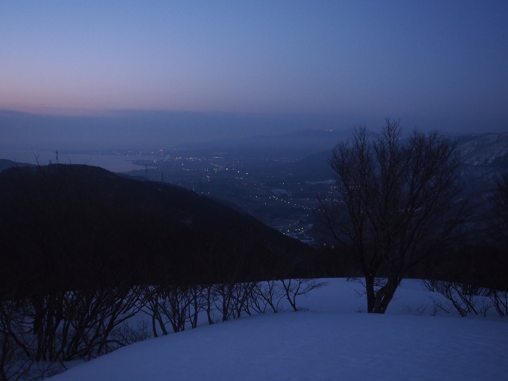 雪原からは眼下に今津から高島の市街の明かりがみえる。その手前で等間隔に並ぶ明かりはメタセコイア並木の街路灯だろう。彼方の朝霧の中で島のように浮かび上がっているのは比良山地だ。その上では蓬莱山のスキー場が不夜城のように強い光を放つ。雪原の青い光景にすっかり魅了され、なかなか先に進めない。