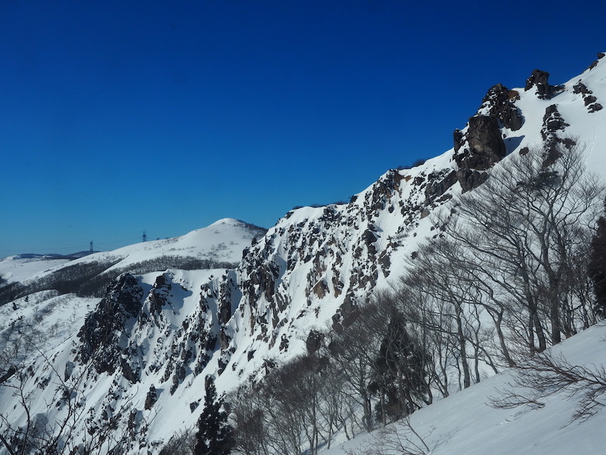 下から山スキーで登ってこられる単独行の男性と出遭う。「この尾根を下る人と出遭うとは思いませんでした」と仰る。登りでは時に使われるが、下降は厳しい箇所があるとのこと、男性はよくこの尾根を登っておられるようだ。