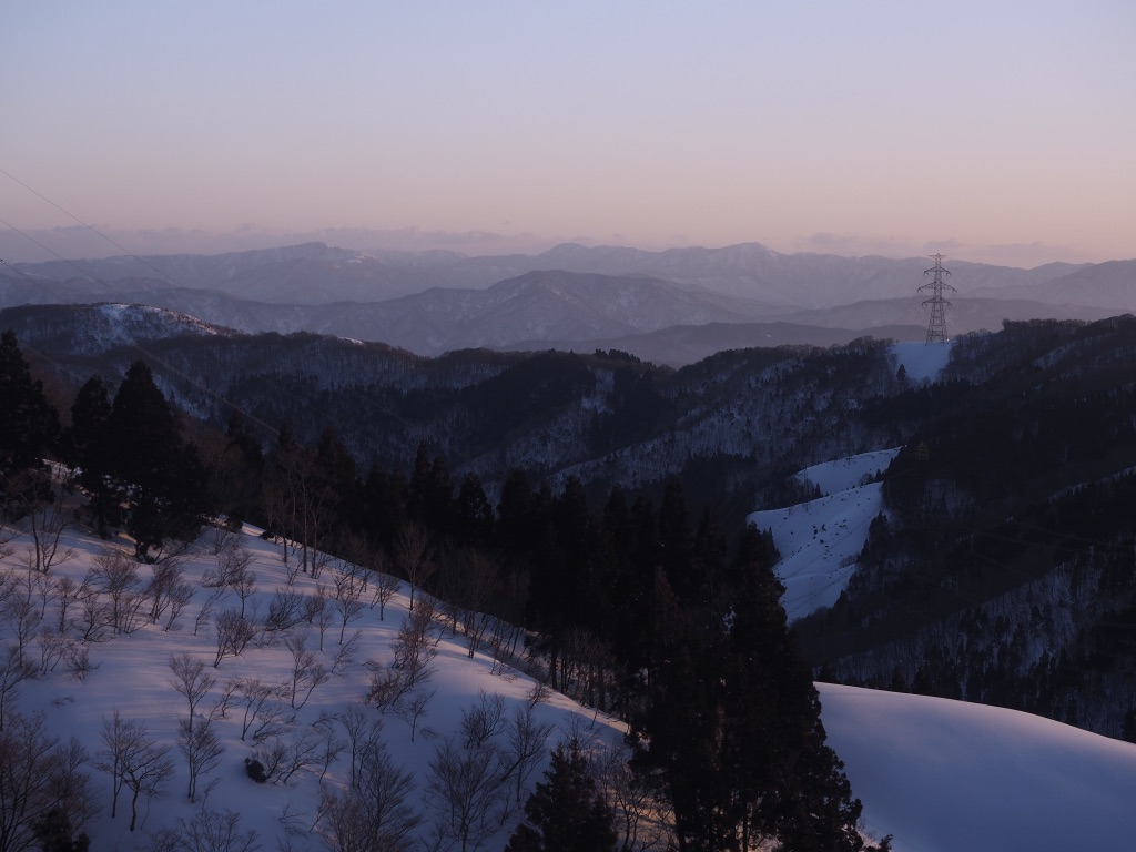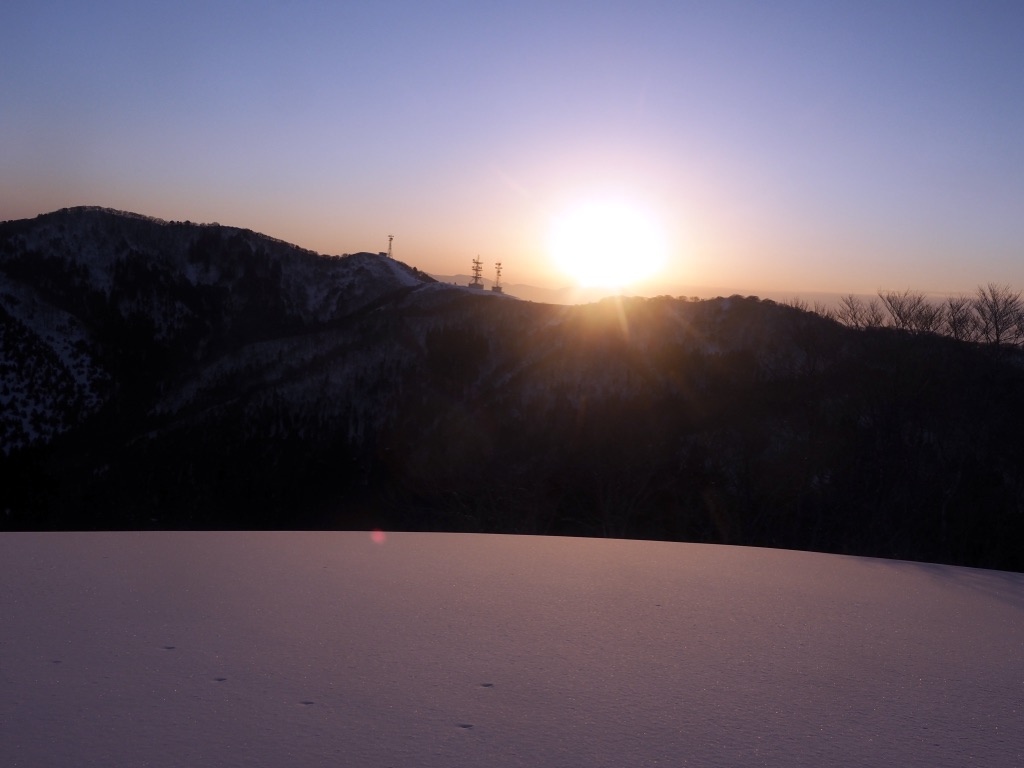 ブナの斜面をのぼりつめたその先は送電線鉄塔のある雪原となっていた。いつのまにか東の空にかかる雲の薄くなり、乗鞍岳へと続く稜線の上を朝日が浮かんでいる。しまった、あとわずかに早ければのご来光を拝むことが出来たことだろう。
