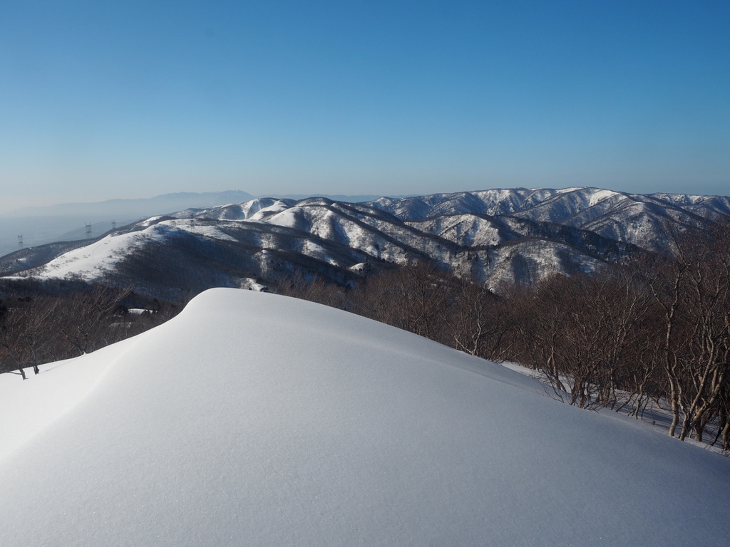 尾根伝いに北尾根に回り込ん山頂を目指す。雪が灌木を覆いつくした今の時期はどこでも自由に歩けるのが嬉しい。