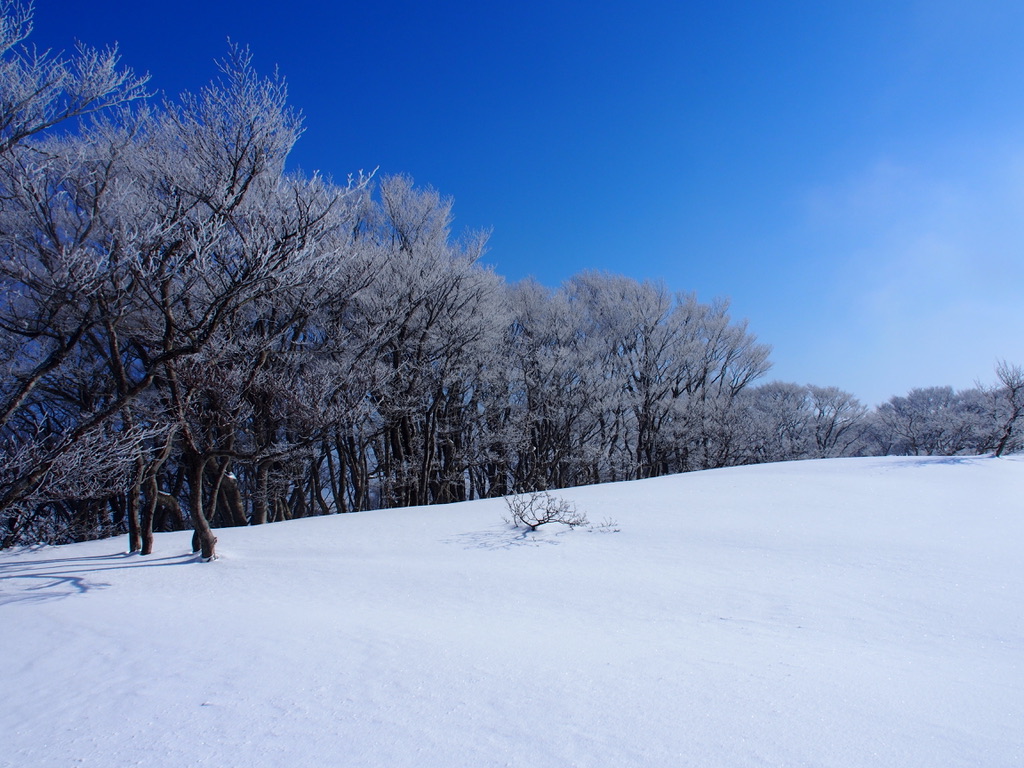 霧氷は先日の武奈ヶ嶽で見たような成長したものではなかったが、それでも樹々の枝先をガラス細工のように煌めかせるには十分であった。霧氷を眺めながら、山頂に向かって平坦な雪原を辿る。雪原の下には灌木の濃密な藪が広がっているとは想像し難いところだ。広々とした雪原の山頂からは山名標がわずかに突き出していた。もう10cmほど積雪していたらGPS無くしてはこの山頂を認識することが出来なかっであろう。