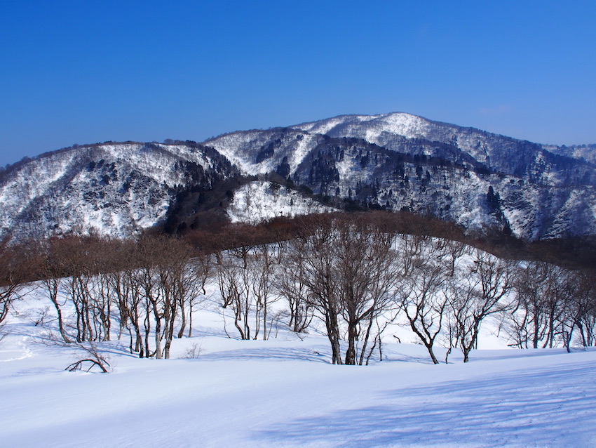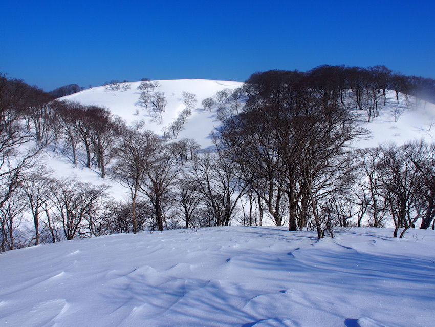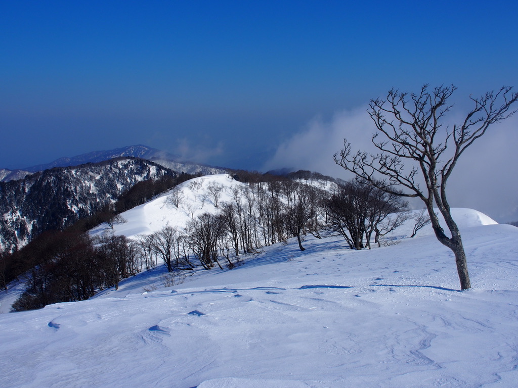 山毛欅の樹林を抜けて石田川ダムへの分岐に戻ると再び武奈ヶ嶽がなだらかな雪庇の尾根の先に姿を見せる。武奈ヶ嶽は眺める角度によってその姿がこうも違う山は珍しいのではないかと思う。南東から眺めると南側からの野坂の山の中で随一といっても過言ではない男性的な斜面に杉の樹が疎らに生ているが、南西からは山頂直下に広々とした鹿ヶ原の雪原から始まり自然林が広がる斜面には杉の樹は全く見当たらない。一方、北側から眺めると南側から眺めた時とは対照になんとも優美で女性的な山容を広げている。