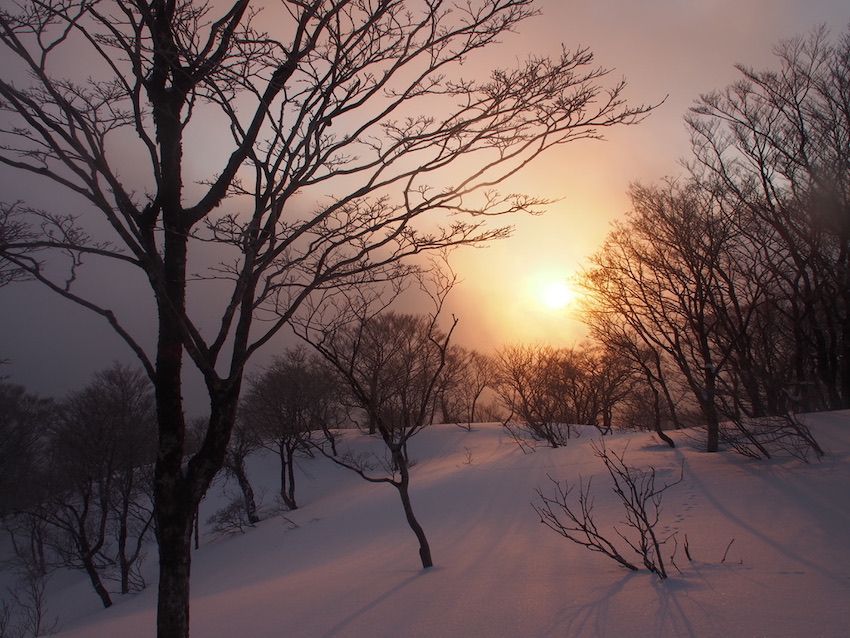 稜線を時折、ちぎれ雲のような霧が気まぐれに通り過ぎてゆく。霧が山毛欅の樹々のシルエットの背景を黄金色に彩る。山毛欅の叢林の中には主のようにひときわ目立つ大樹がある。山毛欅の傍らで、通り過ぎてゆく霧と朝の陽光が戯れる様を楽しんだ。