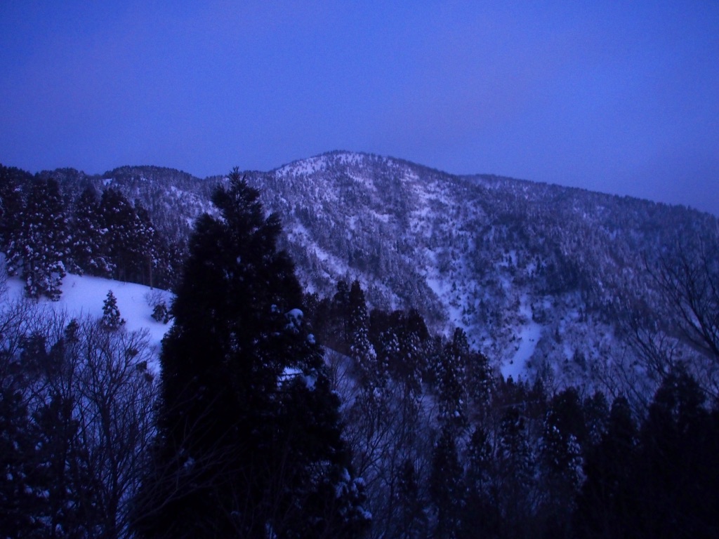 赤岩山が近づくと、ヘッデンのライトがなくても歩けるくらいの明るさとなり、植林の間の展望地からは右手に青藍色に染まった武奈ヶ嶽が綺麗な姿を見せる。しかし、右手に見える筈の三重獄はどうやら雲の中のようだ。