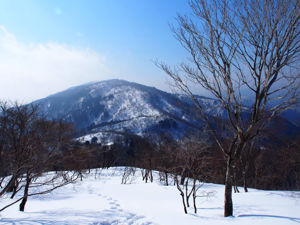 復路は新雪の上に自分のトレースのお陰でかなり楽に歩ける。とはいえ、しばしばトレースから外れては雪原や樹林の中に気儘に新たなトレースを刻むことになるのだが。期待通り、すぐにも武奈ヶ嶽が山上にかかっていた雲の中から姿を現す。