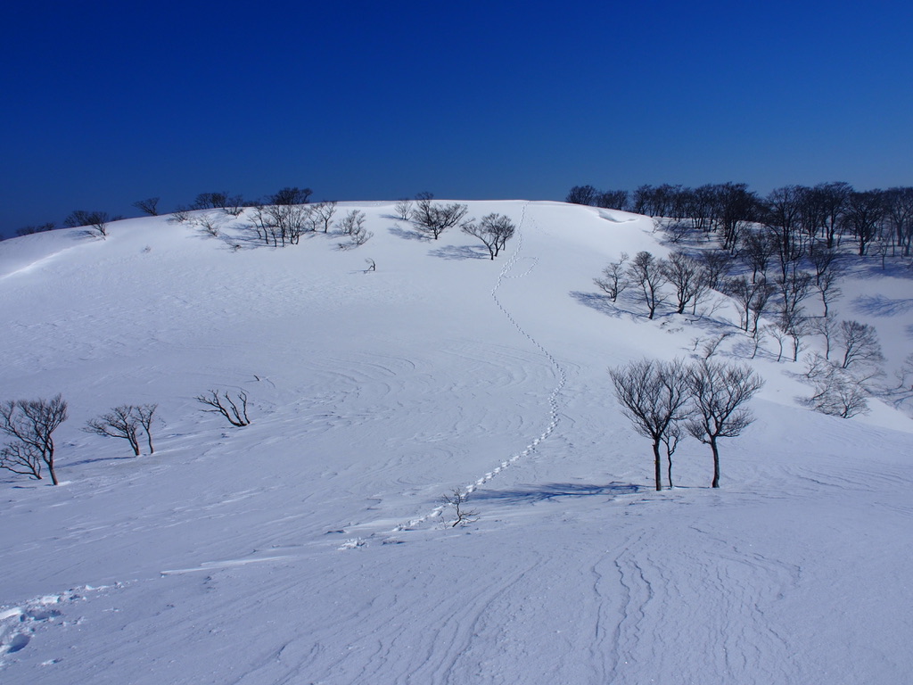 山頂に向かって平坦な雪原を辿る。雪原の下には灌木の濃密な藪が広がっているとは想像し難いところだ。らしいですね。ナズナさんから「三重嶽は積雪期に登る山です」と聞いています。